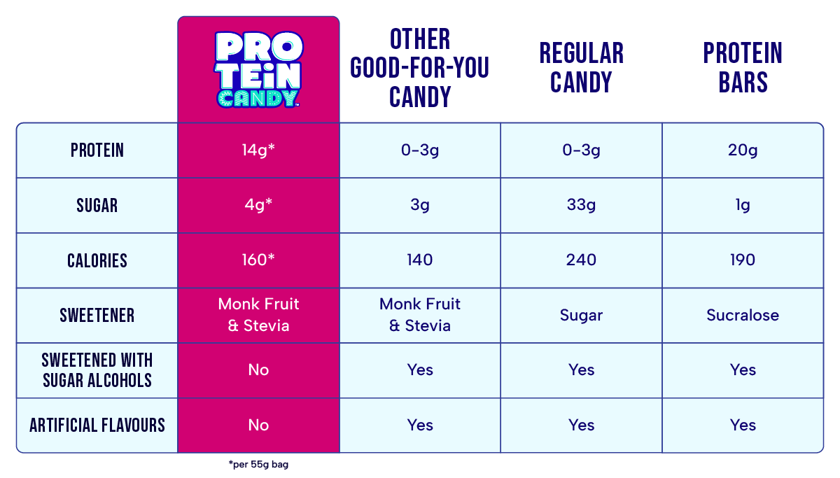 Protein Candy offers delicious candy in multiple flavors with the added benefit of 14g of protein and only 4g of sugar per serving.